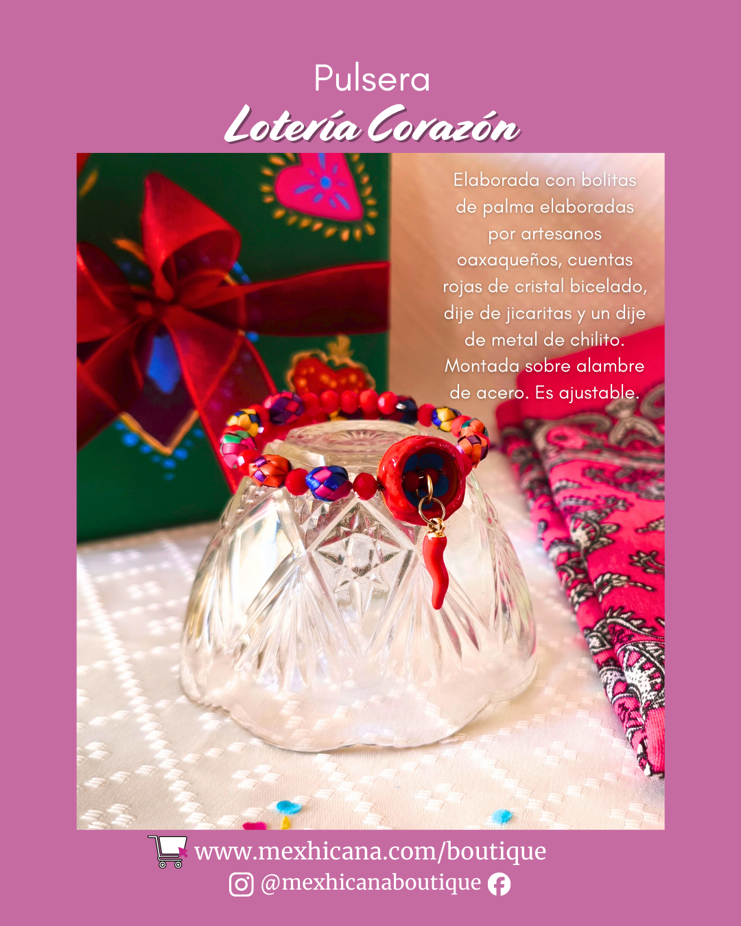 Pulsera “Lotería Corazón” elaborado con bolitas de palma, cuentas de cristal bicelado, 1 dije de jicarita y 1 dije de chilito, montado sobre alambre de acero inoxidable. Es ajustable. (Al ser artesanía: el color y forma de la palma y las jicaras puede variar de acuerdo a la imagen mostrada). Incluye bolsita de tela. Inspirada en el juego tradicional mexicano “Lotería” Incluye bolsita de tela.